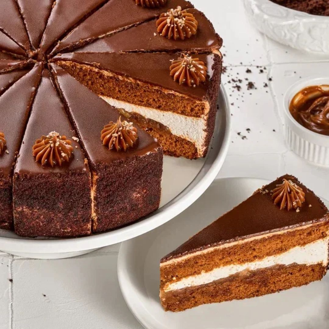 Мягкий пряный бисквит пропитанный сиропом, который идеально сочетается с сырно-творожным кремом. Сочная грушевая прослойка добавляет еще большей свежести и яркую фруктовую нотку. Торт декорирован украшениями из варёного сгущенного молока.